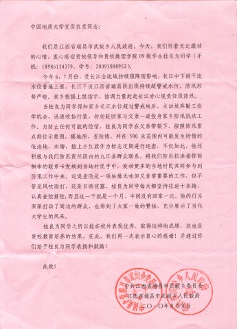 近日,澳门网投官方网站收到江西省瑞昌市武蛟乡人民政府发来的感谢信。在信中,该乡党委和政府对澳门网投官网澳门网投官方网站09级物理一班桂良为同学表示感谢。感谢他在2010年长江防汛的关键时期,主动放弃暑期各种学习机会,深入长江抗洪抢险一线,认真排查各种安全隐患,保护当地人民群众的生命财产安全。桂良为同学的这种行为深深打动了周边群众,得到大家一致赞扬,武蛟乡党委和政府特发来感谢信,向学校和学院教育培养如此优秀的学生表示感谢!