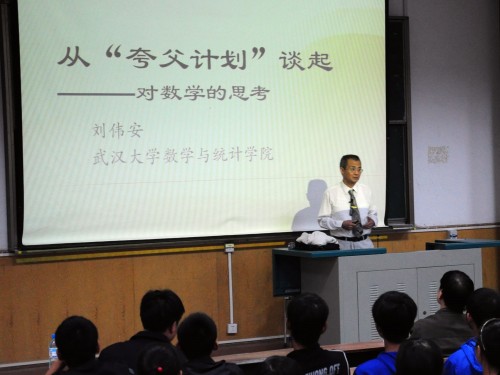 9月25日下午2:30,澳门网投官方网站举行2010级新生入学教育专题讲座(一)。应院长刘安平教授的邀请,湖北省数学协会、武汉数学学会秘书长,全国大学生数学竞赛指导委员会委员,武汉大学数学与统计学院博士生导师刘伟安教授为澳门网投官网2010级新生作了一次题为“数学好玩”的专题报告。院长刘安平教授、副院长彭放教授、院学工组成员出席讲座。刘教授首先通过讲解“夸父计划”引出对有关数学问题的思考,使广大同学认识到数学是认识自然规律的工具,与我们的生活有着密切联系,并在我们的生活中广泛应用。在讲座中,刘教授介绍了中国古代数学的兴衰,并指出数学的发展至今都是内外两个推动力作用的结果,外力是生活实践和认识自然规律的需要,内力是自身发展的需要。他陈省身教授的“有用”数学与“无用”数学为例强调高中数学与大学数学的不同,对于2010级新生如何学好大学数学提出了三点希望:坚持理性思维;坚持独立思考;不要轻信经验,勇于攻坚,勇于创新。