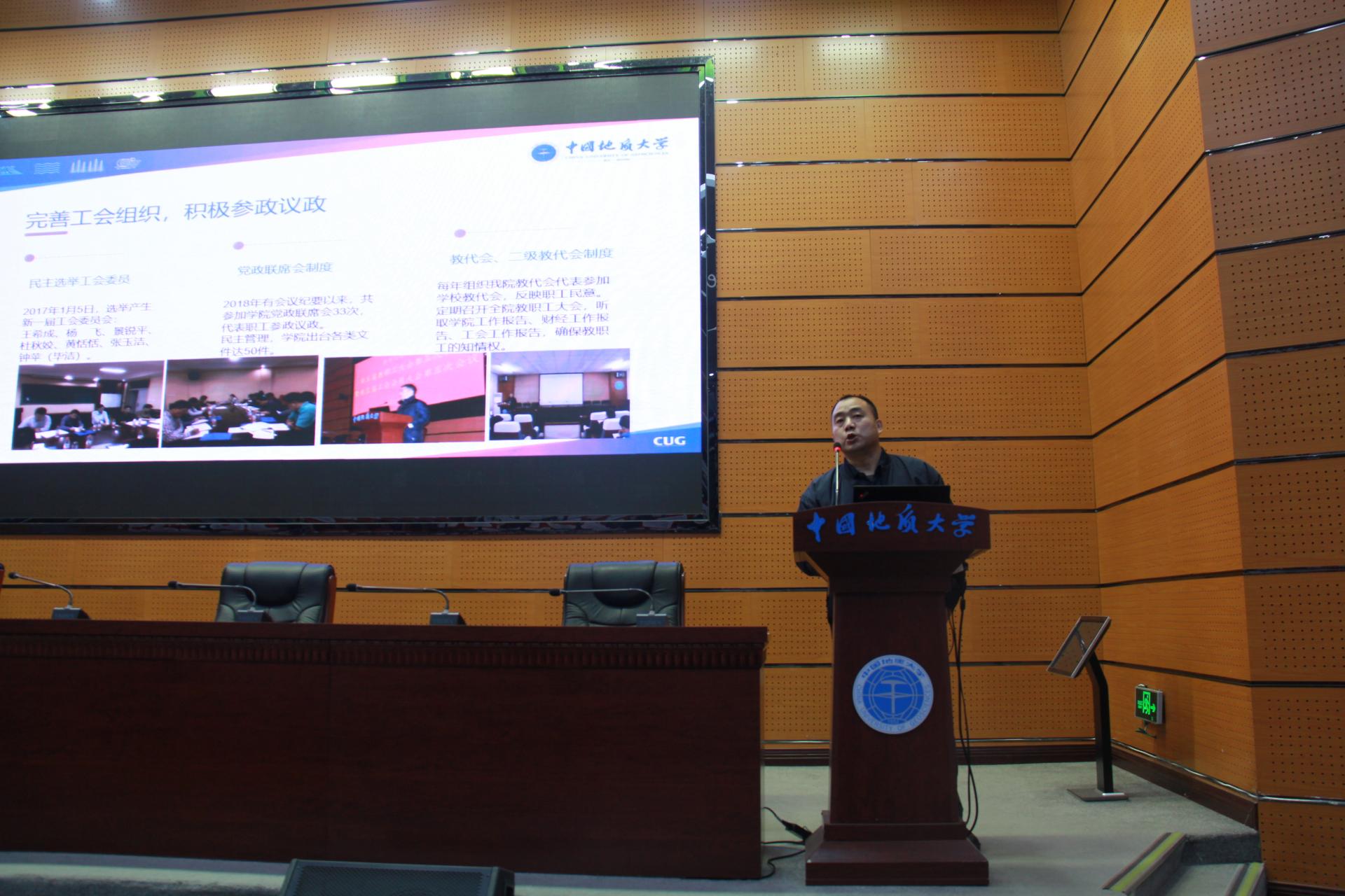 学院分工会主席王希成代表第五届工会委员会做了工会工作报告及经费使用说明。他在报告中回顾了五年来工会工作以及学院工会在学校各项比赛中取得的成绩,号召全院教职工和工会会员要认真学习贯彻党的十九届六中全会精神,以习近平新时代中国特色社会主义思想为指导,按照学院“十四五”规划的建设目标,充分发挥主人翁精神,弘扬“严在地大”优良传统,抓住机遇,迎难而上,为完善学院治理体系,提高学院治理能力,促进学院各项事业迈上新水平、出现新局面而努力奋斗。