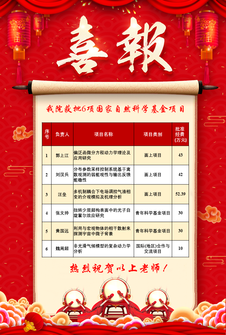 2024年8月23日,国家自然科学基金委员会公布了2024年集中接收期项目评审结果,澳门网投官网共有6个项目获得立项资助,其中面上项目3项、青年科学基金项目2项,国际(地区)合作与交流项目1项。