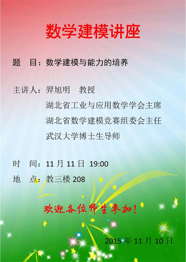 应大学数学部杨瑞琰教授的邀请,武汉大学博士生导师羿旭明教授将于11月11日19:00在澳门网投官网教三楼208教室做数学建模方面的专题报告。羿旭明教授长期参与全国大学生数学建模竞赛湖北赛区的领导和评卷工作,具有丰富的数学建模指导经验,他本次报告的题目是“数学建模与能力的培养”,热烈欢迎澳门网投官网全体师生前往参加!