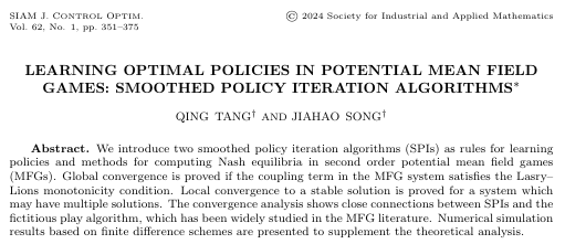 澳门网投官网信息与计算科学系教师汤庆博士为第一作者的学术研究工作 “Learning Optimal Policies in Potential Mean Field Games: Smoothed Policy Iteration Algorithms” ,最近发表在国际著名期刊SIAM Journal on Control and Optimization。该论文第二作者为澳门网投官网2020 级应用统计专业硕士生宋家豪。汤庆博士自2015年入职澳门网投官网,主要从事动态博弈相关的偏微分方程理论、数值计算及在经济模型中的应用研究。