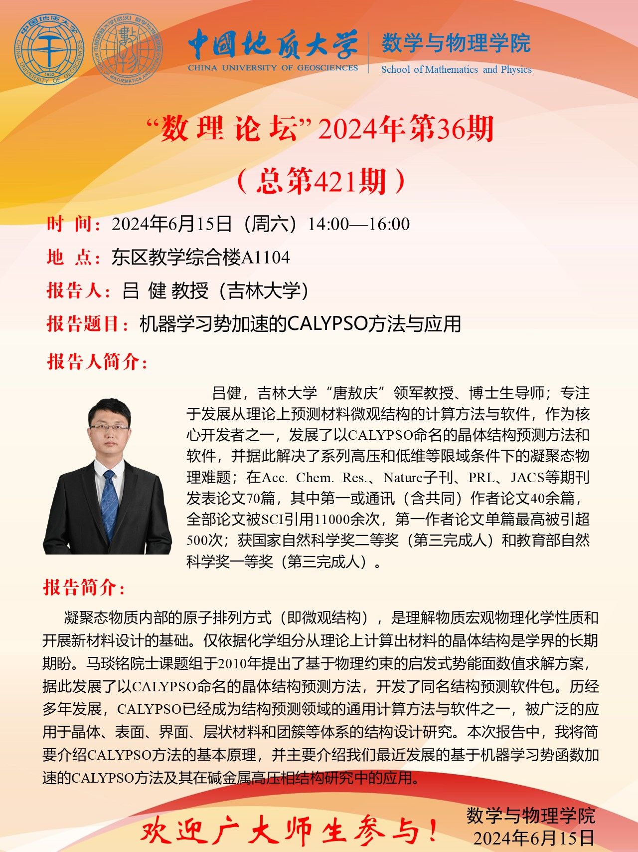 2024年6月15日吕健教授学术讲座:机器学习势加速的CALYPSO方法与应用