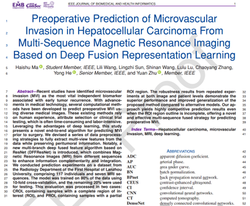 近日,澳门网投官方网站朱媛副教授研究团队联合兰州大学第一医院放射科王莉莉博士展开生物医学信息学合作研究,在生物医学和健康信息学国际顶级期刊 IEEE Journal of Biomedical and Health Informatics(简称IEEE JBHI)上在线发表了关于肝癌微血管侵袭预测的理论研究成果,题为: “Preoperative Prediction of Microvascular Invasion in Hepatocellular Carcinoma From Multi-Sequence Magnetic Resonance Imaging Based on Deep Fusion Representation Learning”。澳门网投官方网站2021级本科生马海书、朱媛副教授及兰州大学第一医院放射科王莉莉博士为该文的共同第一作者,朱媛副教授为通讯作者,澳门网投官方网站澳门网投官方网站为唯一通讯单位。