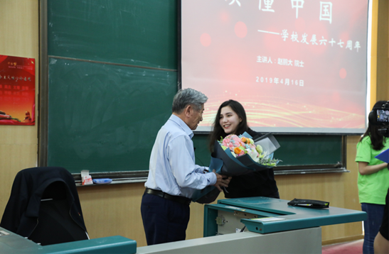 讲座开始前,学生代表向赵院士敬献了鲜花。赵院士分四个阶段讲述了学校自1952年建校以来的发展历史,并结合社会背景和办学特点等,将每一阶段的校史精炼地概括为多个四字短语,如北京地质学院阶段:52建院,出身不凡,莫地为范,国需为先;武汉地质学院阶段:76迁汉,艰难建院,二次创业,恢复发展;中国地质大学阶段:大学冠名,优势集成,“五颜六色”,开拓新境;中国地质大学解体,南北独立办学阶段:南北联手,共建统筹,百年校庆,共贺一流。赵院士对每个词语代表的意义做了详细讲解,如“五颜六色”就生动形象地形容了中国地质大学阶段的特点——“一个大学,两个学区,三个校园,四个实体,五套班子,六有其名”。