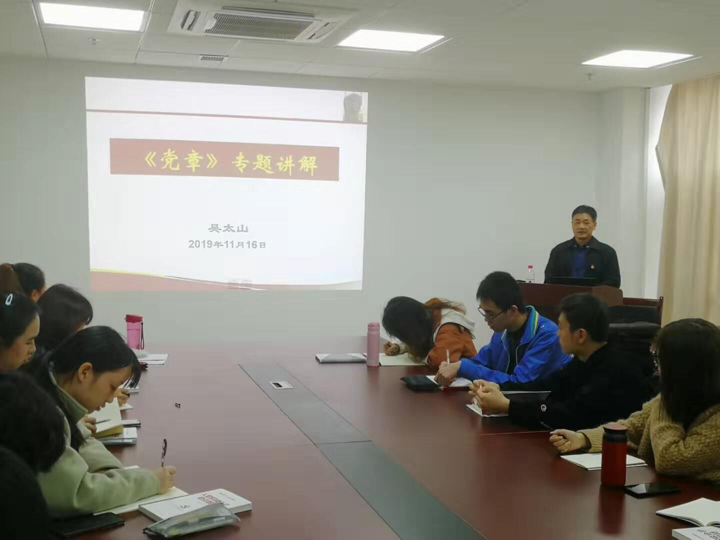 吴太山书记从为什么要深入学习《党章》入手,重点讲解《党章》中“总纲”部分有关党的性质、最高理想和最终目标,党的指导思想及其内涵、作用,中国特色社会主义基本理论、基本路线、基本方略,党的建设内容及要求等方面内容。对《党章》中的11章55条内容从党员和党的干部、党的各级组织、党的纪律、党团关系、党徽党旗等方面进行了归类讲解。吴书记还介绍了《党章》形成和发展的历史过程,历次党代会对《党章》所作的重要修改,特别是党的十九大对党章所做的十个方面重要修改,以帮助学员们更好的理解和掌握现行新《党章》。