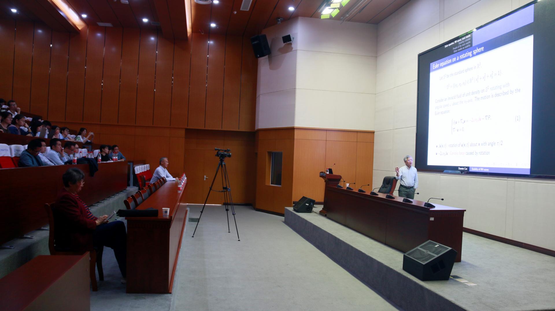 曹道民教授主要介绍了其团队关于二维球面上不可压欧拉方程一类非常重要的精确解Rossby-Haurwitz波的最新研究成果,具体围绕degree-2 的Rossby- Haurwitz波的非线性稳定性展开,证明了数学家Constantin 和 Germain 提出的一个著名猜想。曹教授的讲座内容深刻,深入浅出,非常生动形象和具体的描述了波的来源和产生机制,以及如何利用自然原理推导出一个具体偏微分方程,然后利用新颖的数学方法证明波的非线性不稳定性,在场老师和学生深受启发。讲座结束后,张教授与老师和同学进行了细致地交流和讨论,非常耐心地回答了在场师生的所有问题,现场气氛非常热烈。