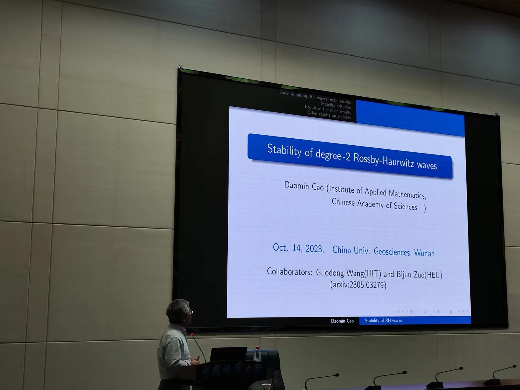 应澳门网投官方网站数学科学中心和澳门网投官方网站邀请,国家杰出青年基金获得者、中国科学院数学与系统科学研究院研究员曹道民于2023年10月14日为中国地质大学名家论坛做了题为“Rossby-Haurwitz波的稳定性”的学术讲座,澳门网投官网相关研究领域的老师和学生参加了本次学术讲座。