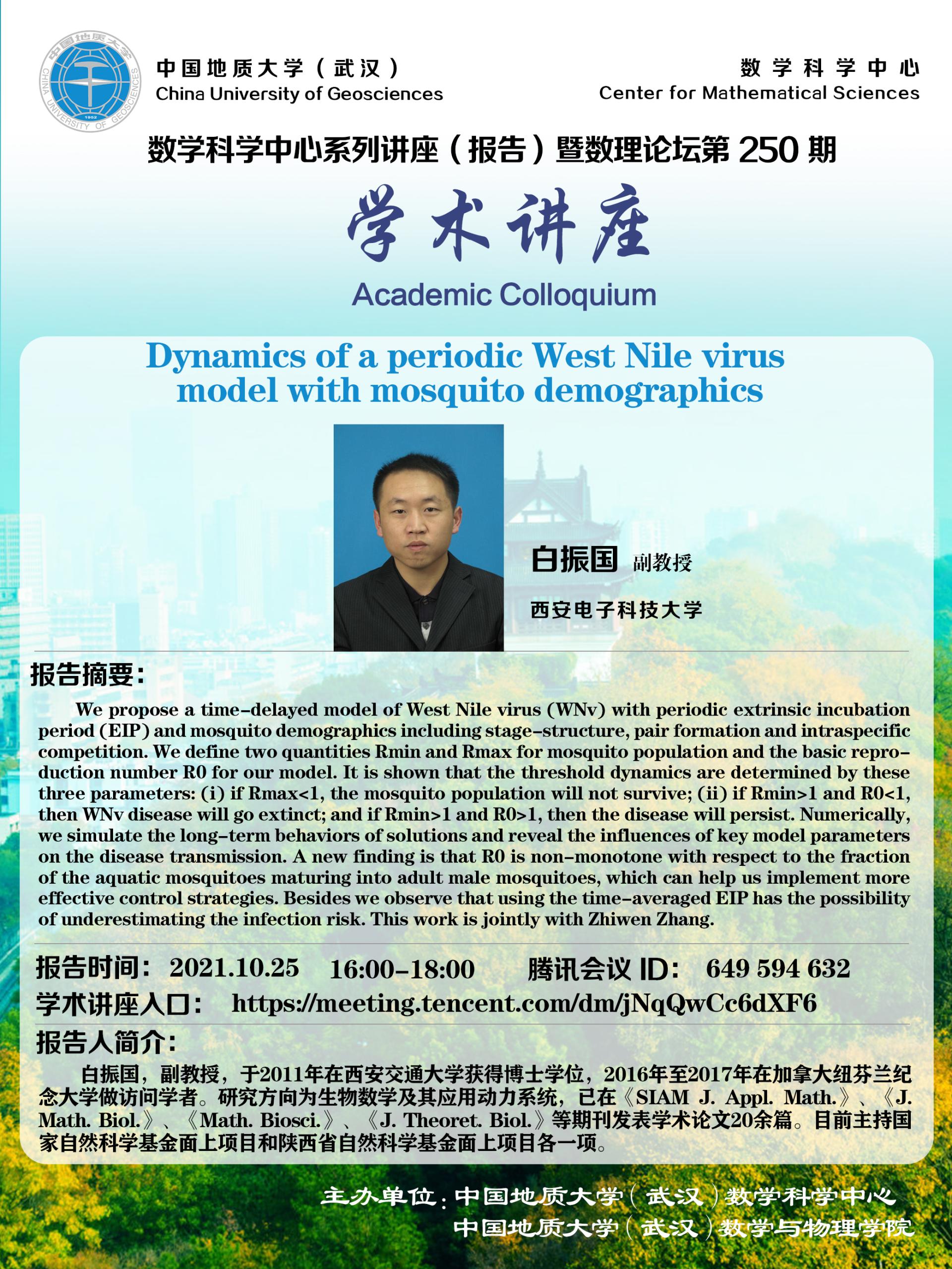 "数理论坛"第250期暨数学科学中心系列讲座(报告):Dynamics of a periodic West Nile virus model with mosquito demographics